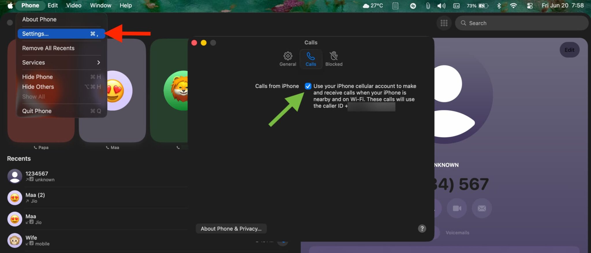 | تنظیمات مک | در برنامه Phone > Settings > Calls گزینه "Calls from iPhone" تیکخورده باشد. |