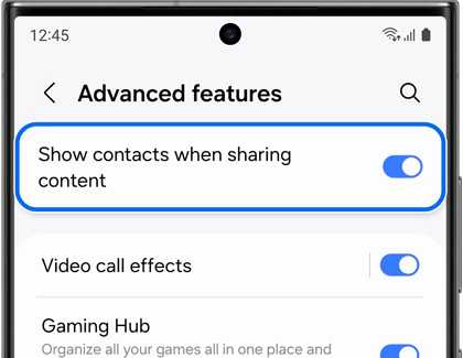 گزینه "نمایش مخاطبان هنگام به اشتراکگذاری محتوا" (Show contacts when sharing content) را پیدا کرده و آن را فعال کنید.