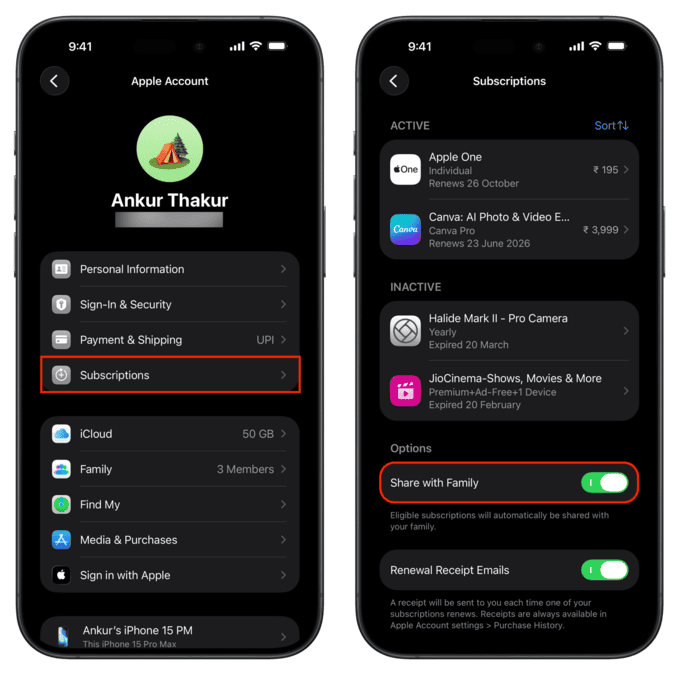 برخی اشتراکها مثل Apple TV+ و Apple Arcade خودکار به اشتراک گذاشته میشوند