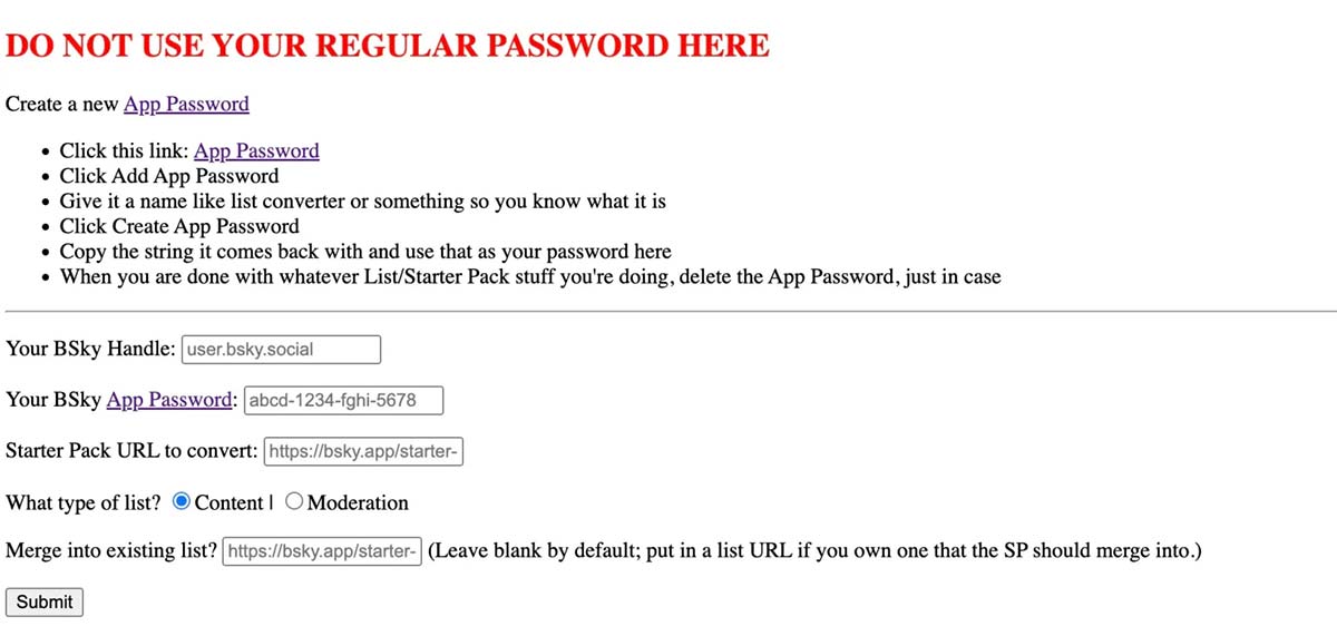 - دکمه Submit را فشار دهید تا Starter Pack بهعنوان یک لیست در بلواسکای شما اضافه شود.